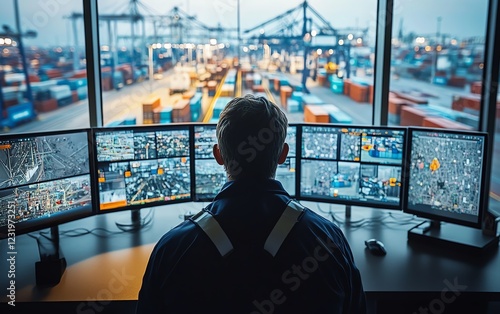 Port control room overseeing cargo operations, symbolizing logistics efficiency, with monitors displaying realtime data and active cargo handling in a busy port