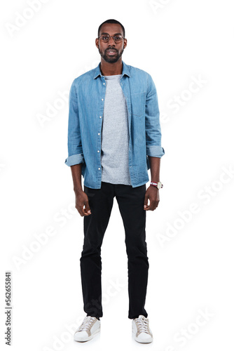 Portrait, fashion and mockup with a model black man in studio isolated on a white background for clothes branding. Style, casual and product placement with a handsome young male posing on blank space