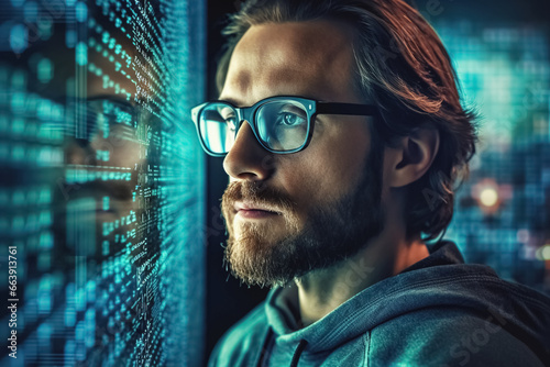 portrait of man and binary code numbers, technology, cyberspace and programming concept. Generative Ai