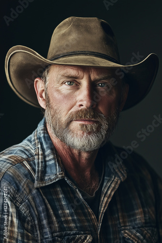 Portrait of a mature man wearing a brown cowboy hat and plaid shirt