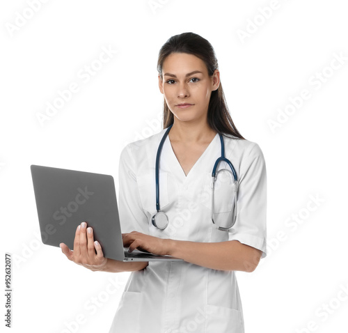 Portrait of beautiful nurse with laptop on white background