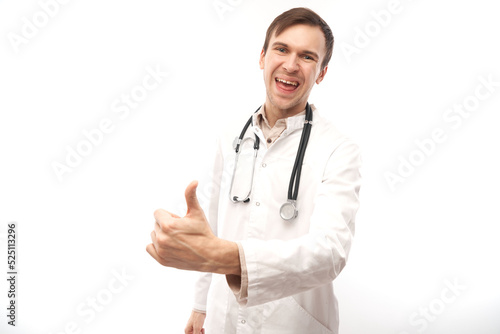 Portrait of happy doctor in white medical coat showing gesture all is well isolated on white background with copy space
