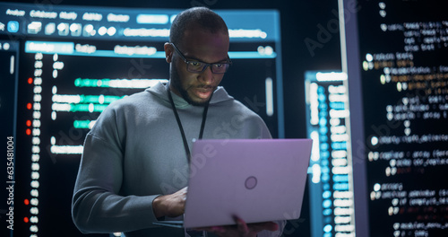 Portrait of Professional Programmer Developing a Big Data Interface Software Project.Young Black Man Working on Laptop Computer, Looking at Big Digital Screen Displaying Back-end Code Lines