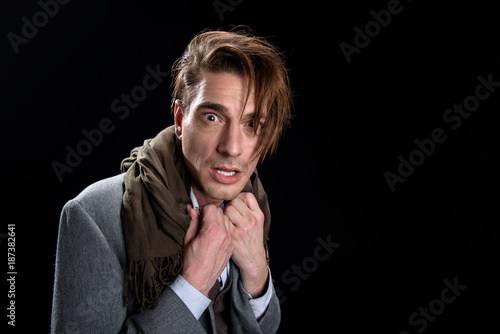 Portrait of scared stressful man is standing and looking at camera with terrify in wide-eyed. He is holding hands on his collar while expressing awfulness. Isolated and copy space in the right side