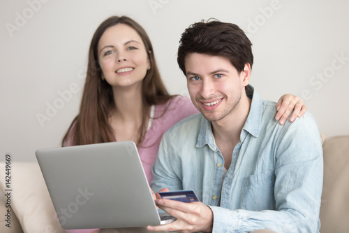 Portrait of young happy couple looking at camera, shopping online via laptop, using e-commerce, internet financial services. Man holding credit card, paying and buying, girlfriend choosing, ordering