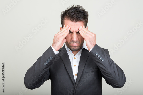 Portrait of young handsome Hispanic businessman in suit