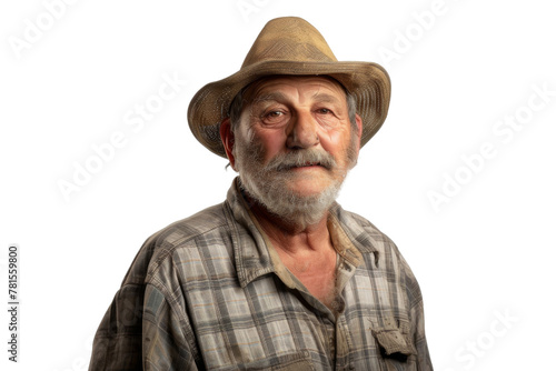 Portrait studio shot of mature senior Farmer man weaning straw hat isolated on transparent png background, person look at camera, agriculture worker.