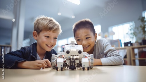 portrait two students learning coding mechanical small robot programming with blurred friend in classroom background