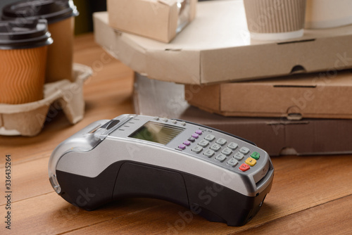 POS terminal on cashier's desk. Coffee paper cups and pizza boxes