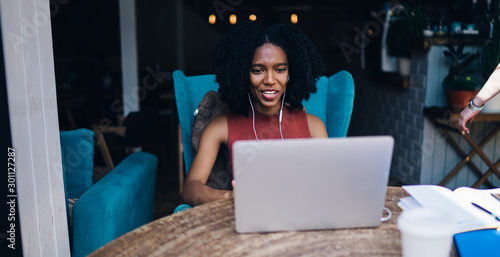 Positive black hipster girl in earphones listening positive audio book via application on laptop device during chatting with followers from social networks, happy woman choosing music playlist