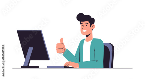 Positive Feedback: Happy Worker Giving a Thumbs up While Using Computer Illustration