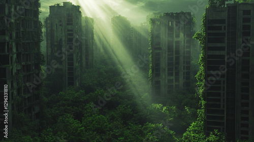 Post apocalyptic urban landscape reclaimed by lush nature and vines