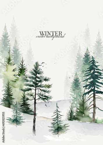 Postcard with Winter Landscape of Coniferous Forest in Watercolor Style with Spruces, Pines, Firs. Vector
