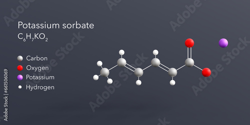 potassium sorbate molecule 3d rendering, flat molecular structure with chemical formula and atoms color coding