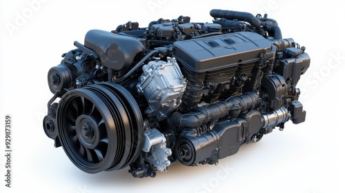 Powerful Black Diesel Engine with Complex Components and Shiny Parts