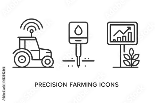 Precision Farming Line Icons Set. Smart Agriculture Technology Symbols. GPS Autonomous Tractor, Soil Moisture Sensor, Yield Monitor, Crop Analytics, Digital Farming Concept. Vector Illustration
