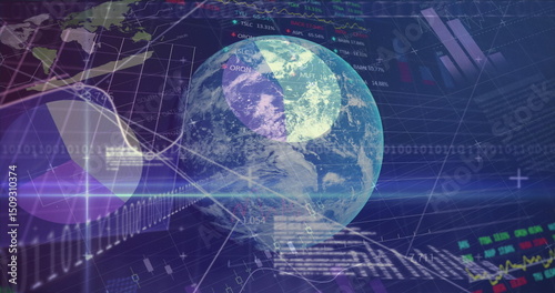 Presenting globe rotating in dark interface, showing pie, bar and line charts with binary code