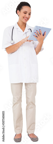 one person, young adult, woman, female, caucasian, practitioner, profession, professional, specialist, uniform, health care, medicals, nurse, tunic, stethoscope, happy, smiling, cheerful, touch screen, scrolling, touching, using, tablet, pretty, beautiful, brown hair, brunette