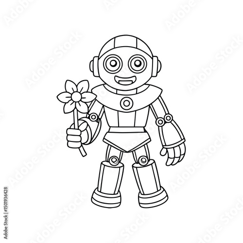 Printable Robot Holding a Flower Coloring Page Vector