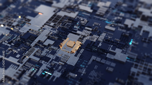 Printed circuit board futuristic server/Circuit board futuristic server code processing. Orange, green, blue technology background with bokeh. 3d rendering
