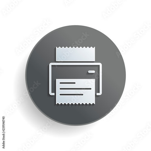 printer, receipt, simple icon. White paper symbol on gray round button with shadow