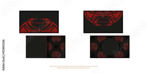 Print-ready business card design with space for your text and face in polizenian style patterns. Black business card design with mask of the gods ornaments.