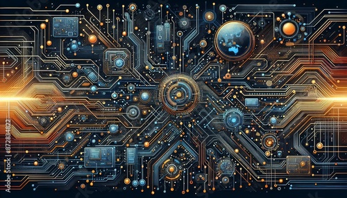 Process lines of motherboard microcircuits, electronic components, chips, nodes, database server paths, energy movement during Internet data transfer.