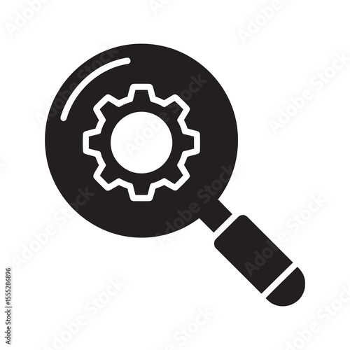 Process optimization icon with magnifying glass over gear for performance analysis and system improvement engineering and technical research vector solid glyph icon