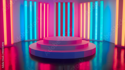 Product display podiums feature a background with colorful vertical stripes and glowing neon lights, advertisement agency, ads campaign marketing.