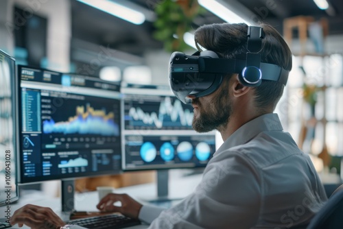 Professional analyzing data with virtual reality headset in office