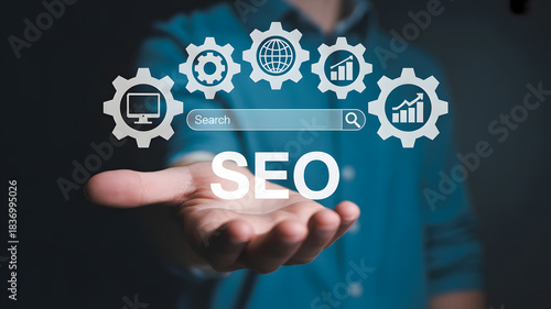 Professional concept for successful digital marketing and search engine optimization strategy displayed over an open hand