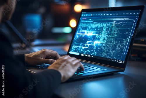 Professional Development programmer typing on a laptop Computer Keyboard. Screens Show Coding Language User Interface.