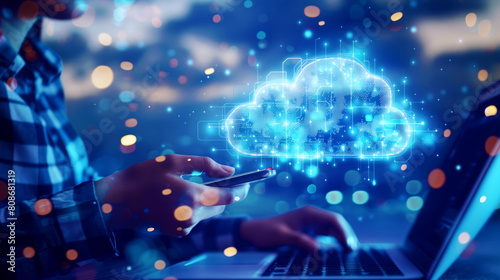 Professional engaging with cloud computing technology, showcasing a holographic cloud data network