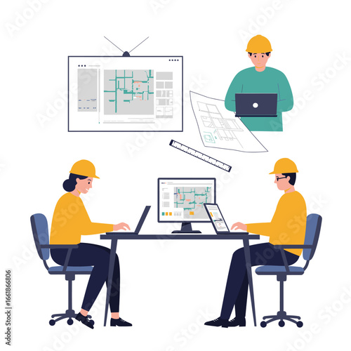 Professional engineering team collaborating on complex architectural blueprints and urban planning designs using digital technology and advanced software solutions.
