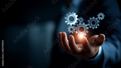 Professional hand holding automation process chart faceless businessman defocused efficiency background driven workflow optimization robotics algorithms innovation productivity