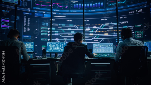 Professional IT Technical Support Specialists and Software Programmer Working on Computers in Monitoring Control Room with Digital Screens with Server Data, Blockchain Network and Surveillance Maps.