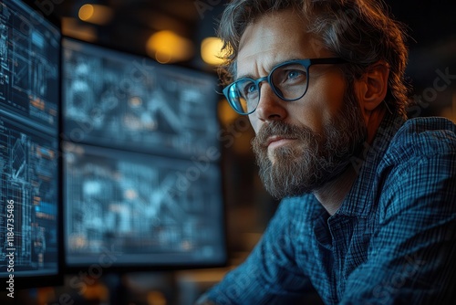professional male software engineer concentrating on multiple computer screens displaying complex architectural blueprints in modern tech office setting