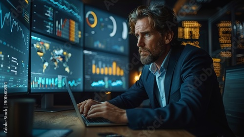 Professional Man Analyzing Complex Data on Multiple Screens in Modern Office Environment. Generative AI