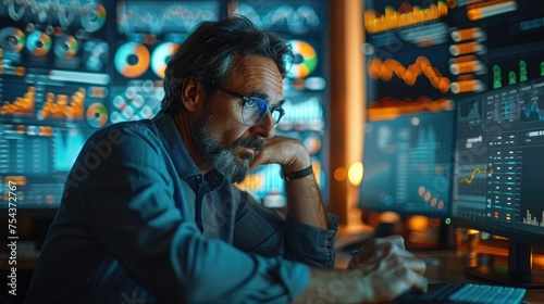 Professionals analyzing financial data with graphs and statistics visible in office. Generative AI.