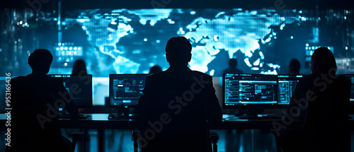 Professionals sitting at their desks, analyzing global data on computer screens with large monitors displaying world maps and data points, creating an atmosphere of national security.
