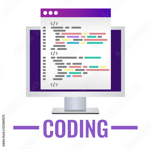 Program code icon in flat style. Personal computer with a code page. programming process, script or other program. Vector illustration isolated