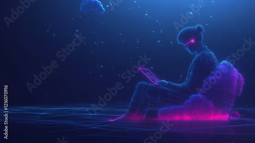 Programmer analyzing big data and AI algorithms on a digital tablet, focusing on deep learning, cloud computing, and futuristic analytics in a tech environment.