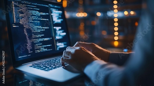 Programmer coding late night on laptop screen showing lines of code software development web work