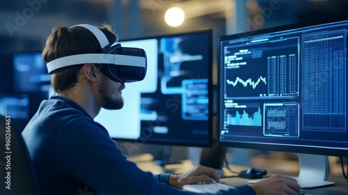Programmer debugging database tools, virtual reality interface, sleek modern setup