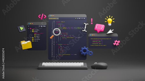 Programmer developer typing script source languages coding symbols icon development project data programming software engineering IT technologies computer. 3d rendering.