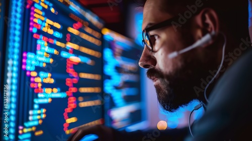 Programmer developing encryption algorithms on a high-resolution screen, ensuring data security - cybersecurity innovation