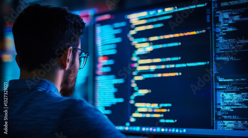 Programmer focuses on coding at night with vibrant screens displaying colorful code in a dark environment