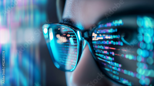Programmer Looking at Code on Screen with Glasses Reflecting Binary Code