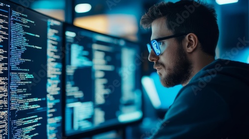 Programmer optimizing code, augmented displays, high-tech environment, blue neon