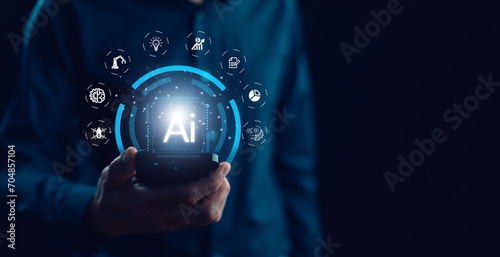 Programmer people working laptops or smartphones with AI, artificial intelligence software engineer coding on laptop computers with technology icons and binary code, big data, Ai bot digital machine